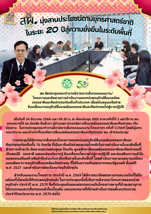 เมื่อวันที่ 24 ธันวาคม 2568 เวลา 09.30 น. ณ ห้องประชุม 1005 อาคารทิปโก้ 2 เลขาธิการ สผ. มอบหมายให้ ดร.ฉัตรชัย อินต๊ะทา ผู้อำนวยการกองจัดการสิ่งแวดล้อมธรรมชาติและศิลปกรรม เป็นประธานในการประชุมคณะทำงานพิจารณากลั่นกรองแผนงาน/โครงการฯ ครั้งที่ 1/2569 โดยมีผู้แทนคณะทำงาน และเจ้าหน้าที่กองจัดการสิ่งแวดล้อมธรรมชาติและศิลปกรรม สผ. เข้าร่วมประชุม