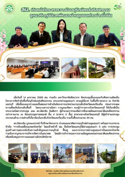 เมื่อวันที่ 14 มกราคม 2569 สผ. ร่วมกับ มหาวิทยาลัยศิลปากร จัดประชุมชี้แจงและรับฟังความคิดเห็นโครงการจัดทำผังพื้นที่อนุรักษ์แหล่งศิลปกรรม ประเภทย่านชุมชนเก่า ตามภูมินิเวศ ในพื้นที่ภาคกลาง ณ จังหวัดนนทบุรี เพื่อชี้แจงแนวทางและขั้นตอนการดำเนินโครงการแก่หน่วยงานระดับจังหวัดและท้องถิ่น ก่อนการระดมความคิดเห็นในระดับพื้นที่ โดยนางสาวปาณิสรา กาญจนะจิตรา รองผู้ว่าราชการจังหวัดนนทบุรี ให้เกียรติเป็นประธานเปิดการประชุม และ ดร.ฉัตรชัย อินต๊ะทา ผู้อำนวยการกองจัดการสิ่งแวดล้อมธรรมชาติและศิลปกรรม กล่าวรายงาน ณ ห้องประชุมราชพฤกษ์ ชั้น 4 (อาคาร 5 ชั้น) ศาลากลางจังหวัดนนทบุรี มีผู้เข้าร่วมประชุม ประกอบด้วย ภาคส่วนที่เกี่ยวข้องในระดับจังหวัดและท้องถิ่น รวมทั้งสิ้นประมาณ 30 คน