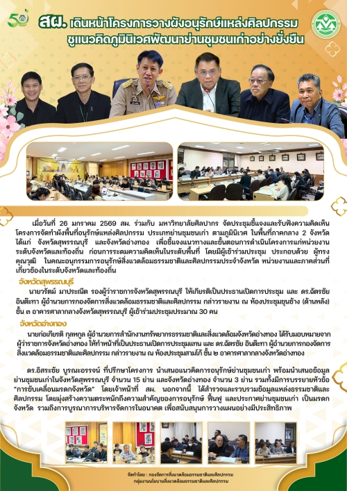เมื่อวันที่ 26 มกราคม 2569 สผ. ร่วมกับ มหาวิทยาลัยศิลปากร จัดประชุมชี้แจงและรับฟังความคิดเห็นโครงการจัดทำผังพื้นที่อนุรักษ์แหล่งศิลปกรรม ประเภทย่านชุมชนเก่า ตามภูมินิเวศ ในพื้นที่ภาคกลาง 2 จังหวัด ได้แก่ จังหวัดสุพรรณบุรี และจังหวัดอ่างทอง เพื่อชี้แจงแนวทางและขั้นตอนการดำเนินโครงการแก่หน่วยงานระดับจังหวัดและท้องถิ่น ก่อนการระดมความคิดเห็นในระดับพื้นที่ โดยมีผู้เข้าร่วมประชุม ประกอบด้วย ผู้ทรงคุณวุฒิ ในคณะอนุกรรมการอนุรักษ์สิ่งแวดล้อมธรรมชาติและศิลปกรรมประจำจังหวัด หน่วยงานและภาคส่วนที่เกี่ยวข้องในระดับจังหวัดและท้องถิ่น