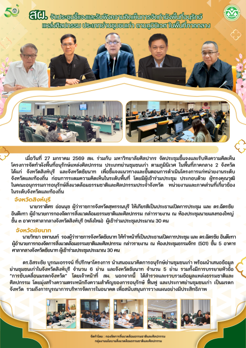 เมื่อวันที่ 27 มกราคม 2569 สผ. ร่วมกับ มหาวิทยาลัยศิลปากร จัดประชุมชี้แจงและรับฟังความคิดเห็นโครงการจัดทำผังพื้นที่อนุรักษ์แหล่งศิลปกรรม ประเภทย่านชุมชนเก่า ตามภูมินิเวศ ในพื้นที่ภาคกลาง 2 จังหวัด ได้แก่ จังหวัดสิงห์บุรี และจังหวัดชัยนาท เพื่อชี้แจงแนวทางและขั้นตอนการดำเนินโครงการแก่หน่วยงานระดับจังหวัดและท้องถิ่น ก่อนการระดมความคิดเห็นในระดับพื้นที่ โดยมีผู้เข้าร่วมประชุม ประกอบด้วย ผู้ทรงคุณวุฒิ ในคณะอนุกรรมการอนุรักษ์สิ่งแวดล้อมธรรมชาติและศิลปกรรมประจำจังหวัด หน่วยงานและภาคส่วนที่เกี่ยวข้องในระดับจังหวัดและท้องถิ่น