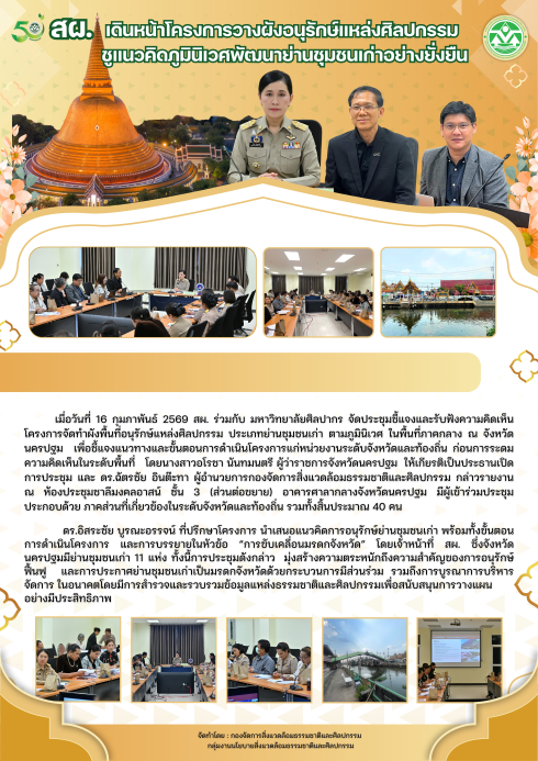 เมื่อวันที่ 16 กุมภาพันธ์ 2569 สผ. ร่วมกับ มหาวิทยาลัยศิลปากร จัดประชุมชี้แจงและรับฟังความคิดเห็นโครงการจัดทำผังพื้นที่อนุรักษ์แหล่งศิลปกรรม ประเภทย่านชุมชนเก่า ตามภูมินิเวศ ในพื้นที่ภาคกลาง ณ จังหวัดนครปฐม เพื่อชี้แจงแนวทางและขั้นตอนการดำเนินโครงการแก่หน่วยงานระดับจังหวัดและท้องถิ่น ก่อนการระดมความคิดเห็นในระดับพื้นที่ โดยนางสาวอโรชา นันทมนตรี ผู้ว่าราชการจังหวัดนครปฐม ให้เกียรติเป็นประธานเปิดการประชุม และ ดร.ฉัตรชัย อินต๊ะทา ผู้อำนวยการกองจัดการสิ่งแวดล้อมธรรมชาติและศิลปกรรม กล่าวรายงาน ณ ห้องประชุมชาลีมงคลอาสน์ ชั้น 3 (ส่วนต่อขยาย) อาคารศาลากลางจังหวัดนครปฐม มีผู้เข้าร่วมประชุม ประกอบด้วย ภาคส่วนที่เกี่ยวข้องในระดับจังหวัดและท้องถิ่น รวมทั้งสิ้นประมาณ 40 คน